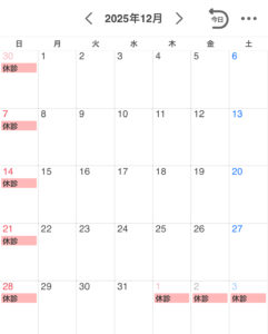 すべて 年末年始のお知らせ 2025.12.15 12月30日 18時まで診療 12月31日 午前診療 1月1日~1月6日 休診 1月7日より平常通り診療します Post Share Hatena Pocket RSS feedly Pin it 交通事故でお悩みの方 前の記事